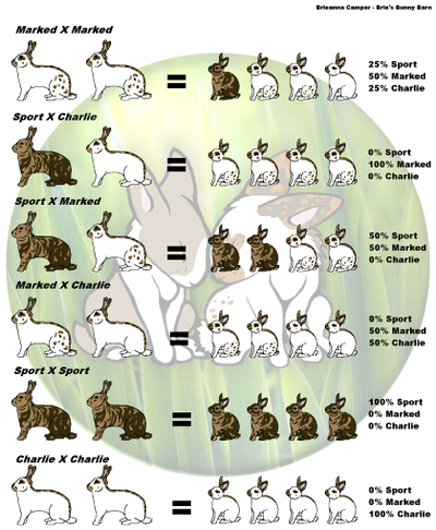 Charlie – A Charlie Rhinelander is 90% white with very little color, mostly on the butterfly, ears and spine. Charlies must be bred to a solid (Sport) in order to have any “show quality” offspring.